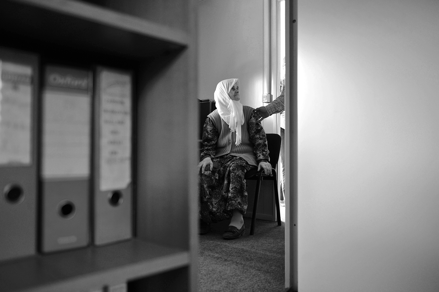 The mother of Srebrenica Dulsa Alic (1938) waits at the premises of the Podrinje Identification Project to assists in the recognition and DNA analysis of remains. During the genocide, she lost two sons and her husband. Her husband has been identified and buried, her oldest son is in the process of being identified, and her youngest son is still missing.